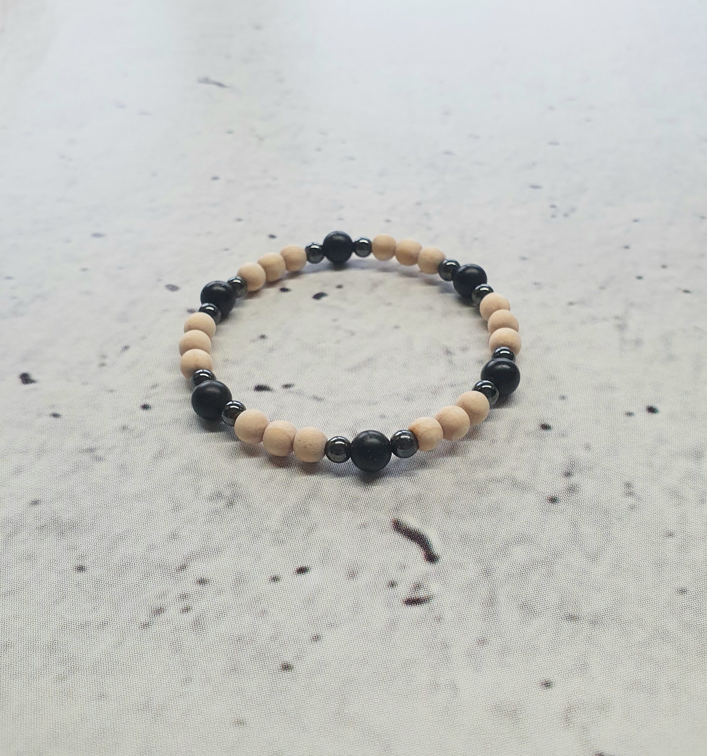 • elastisches Armband mit Onyx, Hämatit und Zirbenholz,